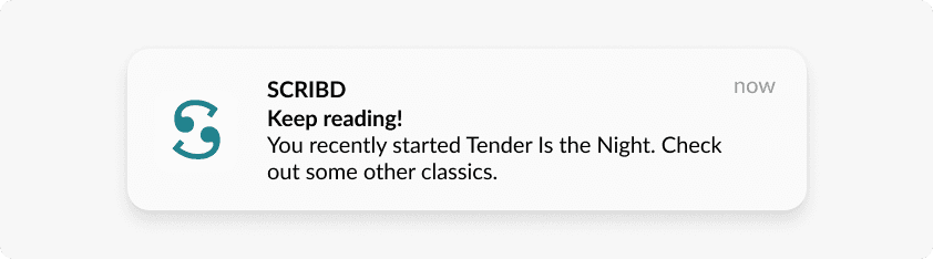 For example, Scribd, a reading app, certainly knows its users’ tastes in books, so it notifies them of some more content that may interest them as well:
